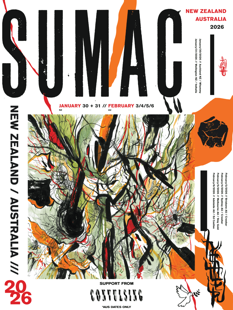Renowned US experimental metal trio SUMAC will make their long-awaited Australian debut in February 2026, bringing their boundary-pushing live show to Auckland, Wellington, Brisbane, Sydney, Melbourne, and Adelaide.